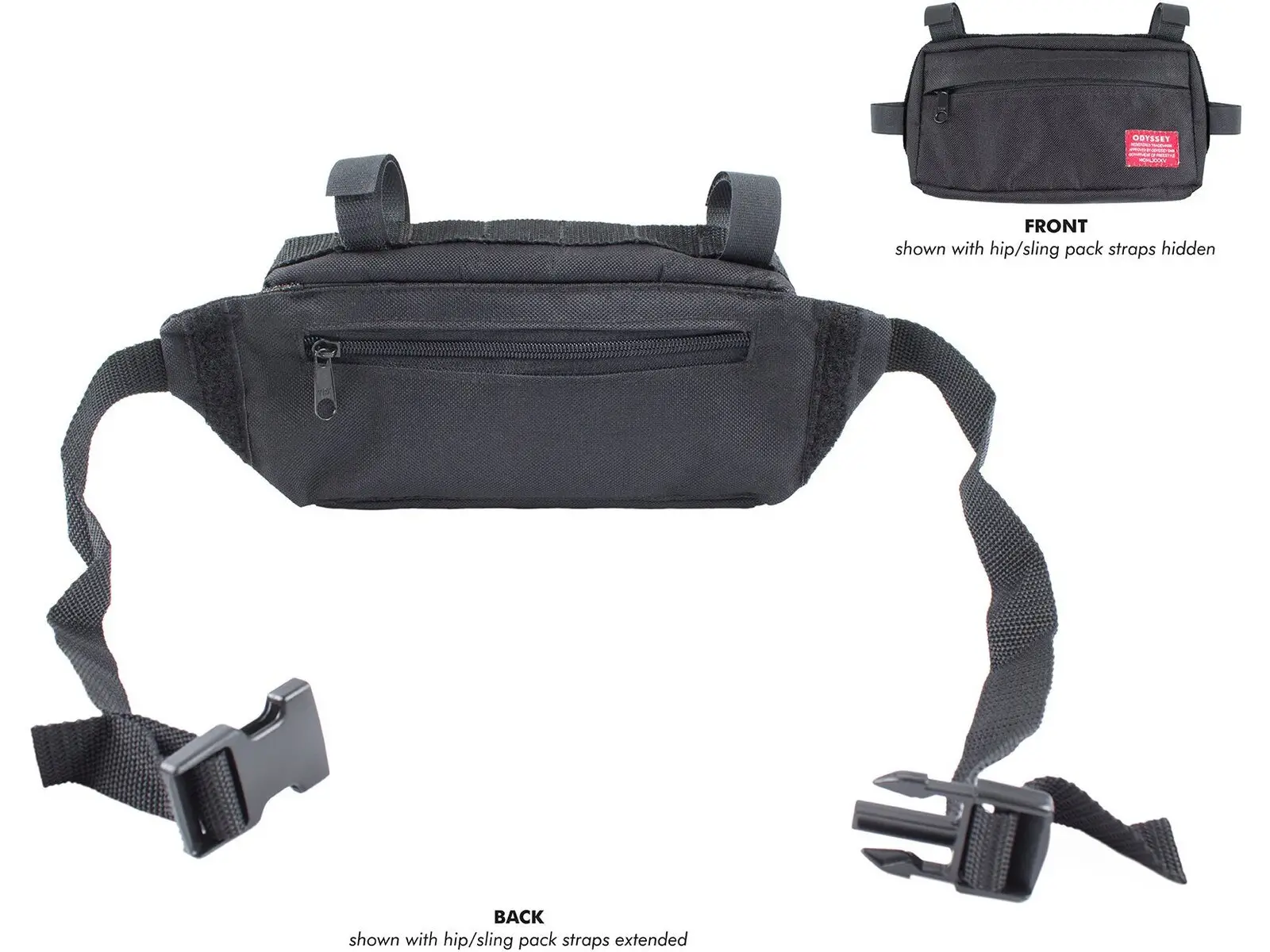 Odyssey 2?in?1 Multi?use Switch Pack Black The Switch Pack is our new multi-use 2-in-1 pack. It can be used on your bike in multiple ways, and also as a Hip/Sling pack! This is the perfect pack to carry your stuff. Available in Black only. Features Large main compartment Small secondary compartment Modular attachment system to fasten to your frame or handlebars Adjustable hide-away waist and shoulder strap with buckle Woven logo label Specs 4 Velcro straps 1 Waist/Shoulder strap 3.75" (H) x 8" (L) x 2.25" (W)